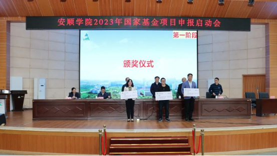 张来对《安顺学院2023年国家基金项目申报工作方案》进行了具体部署。校领导为2022年3位获得国家自然基金项目的科研工作者进行颁奖。