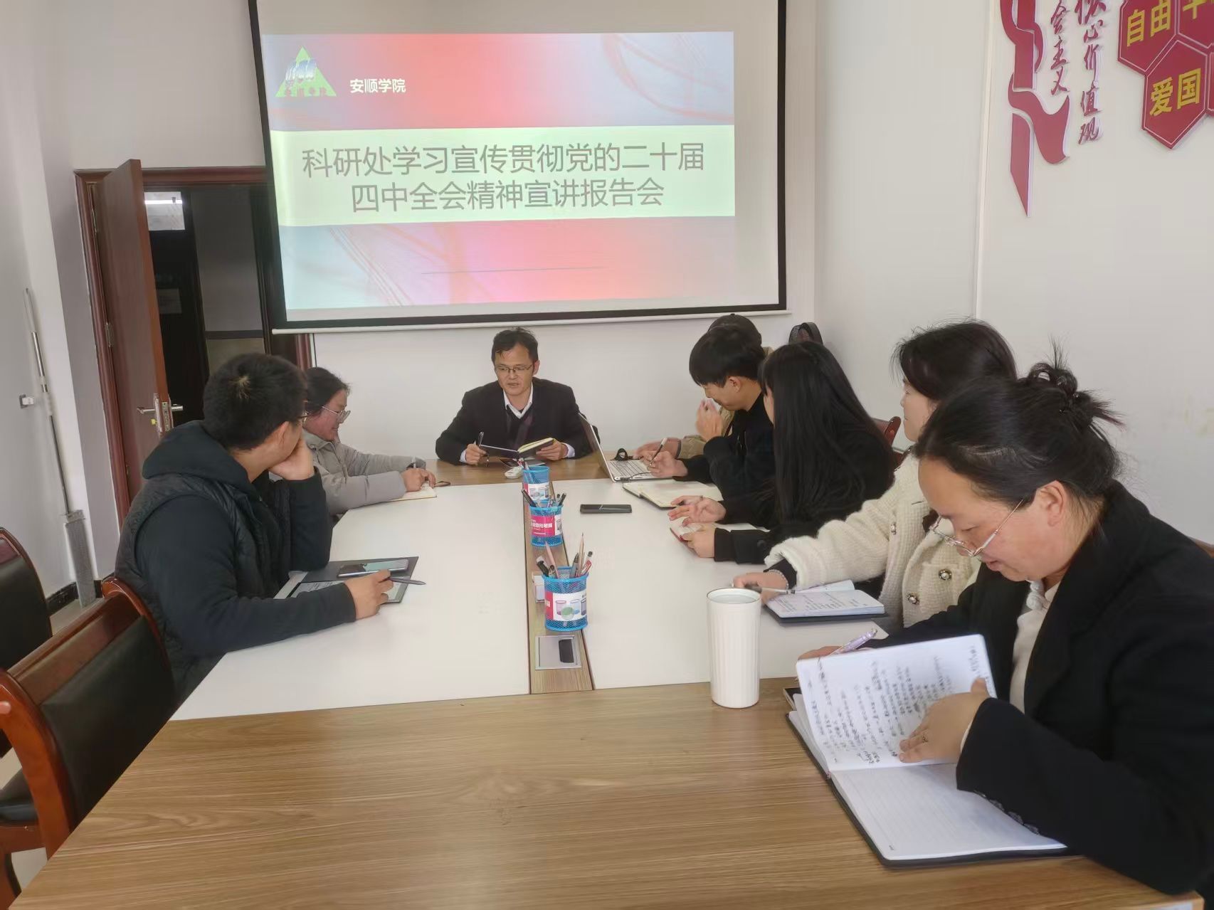 为深刻领会党的二十届四中全会精神核心要义,切实把思想和行动统一到党中央决策部署上来,2025年11月21日下午,安顺学院科研处组织全体教职工开展专题学习会,通过集中研讨、交流分享、任务部署等形式,推动全会精神在科研管理工作中落地生根。