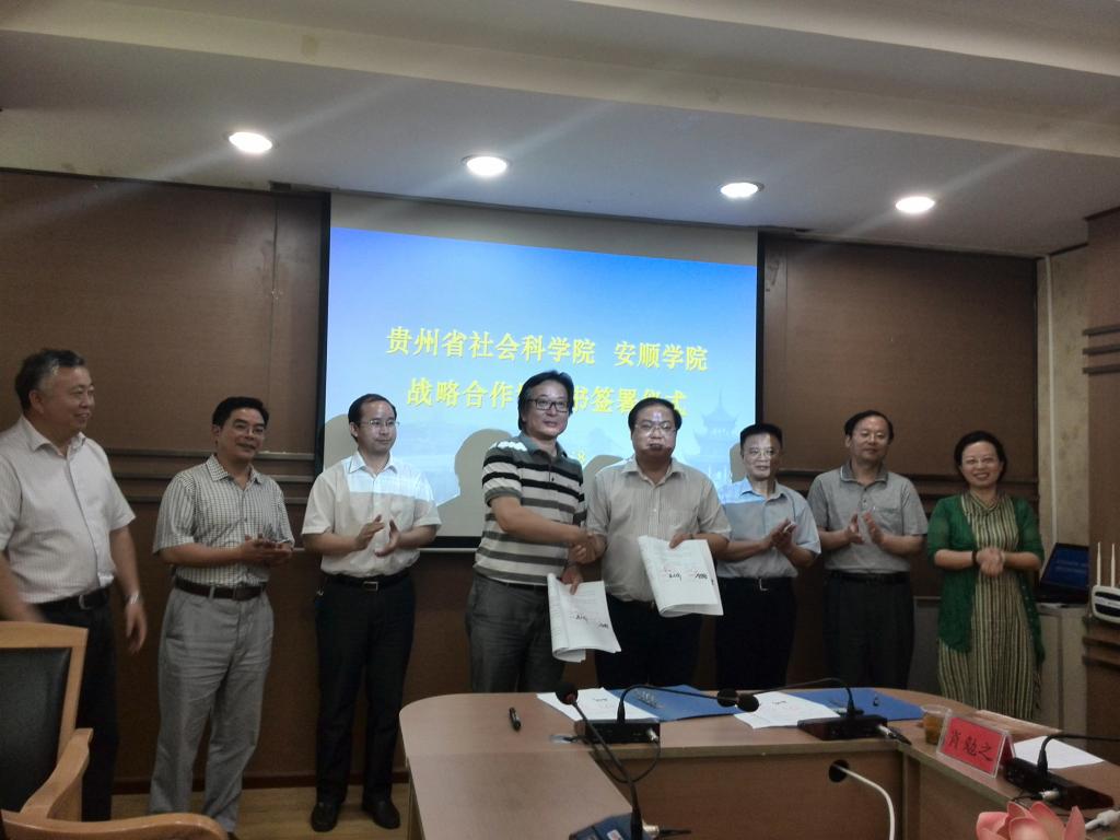6月18日下午,安顺学院与贵州省社会科学院战略合作协议签字仪式在贵州省社会科学院会议室隆重举行。安顺学院党委书记罗荣彬、校长李建军、副校长熊副校长王芳恒、令狐荣涛,以及安顺学院党政办韦英主任、科研处张来处长出席签字仪式。贵州省社科院党委书记金安江、院长吴大华、副院长索晓霞、科研处王兴翼处长、编辑部黄旭东副主任等参会。签字仪式由贵州省社会科学院吴大华院长主持。