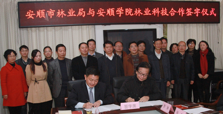 2013年11月27日上午,安顺学院与安顺市林业局在安顺学院行政楼会议室签订林业科技合作协议。安顺学院院长李建军教授,党委副书记陶文彩、副院长王芳恒教授出席签字仪式。学校党政办主任韦英、宣传部部长蔡少平教授、科研处处长张来教授、教务处处长支敏教授、资环学院院长冯开禹教授、化学化工学院院长李琳教授、继续教育学院院长吴霞副教授、农学院副院长李光博士等参加了会议。安顺市林业局局长胡强、副局长张凯、副局长周岐柱总工程师,安顺市林科所所长程友忠工程师、副所长钟漫高级园艺师、高级工程师韦景枫等出席签字仪式。会议由陶文彩副书记主持。