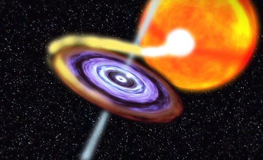 但在某些特定情形下,黑洞吸积盘的稳定取决于源自正常伴星的物质流供应。有些时候黑洞的吸积盘会无法维持一个稳定的下降物质流,于是这些物质就开始在两个极端情形之间跳转——要么物质在吸积盘的外侧边缘聚集,就像河水被大坝阻挡一样,此时吸积盘的温度更低,电离程度更低;或者反过来,都聚集在吸积盘的内侧,大量物质涌向黑洞,此时温度更高,电离程度也更高。
