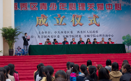 2012年10月10日下午,西秀区青少年心理关爱中心成立仪式在我校礼堂广场隆重举行。安顺学院党委委员、副校长令狐荣涛,学工部部长殷红敏,统战部部长刘成玉,教育管理系主任刘昌友,团委副书记邬贤芳,西秀区委副书记杨平,区政协副主席戴瑜高,共青团西秀区委书记鄢惠出席了仪式。此外,区委宣传部、区教育局、区关工委、区妇联、区综治办、区文明办负责人,各中小学团委负责人以及安顺学院心理咨询中心全体工作人员也参加了此次揭牌仪式。仪式由区政府副区长冯文刚主持。